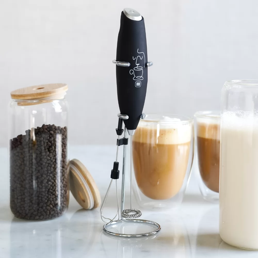 “Una línea completa para un gran café en casa” n nÉste batidor pequeño y elegante es el aliado perfecto en tu cocina. Con su doble función, puedes espumar leche para tus bebidas frías o calientes favoritas, y batir pequeñas preparaciones con facilidad. n nSu diseño no solo añade un toque especial a tu espacio, sino que también incluye una práctica base para apoyarlo sin ensuciar.
