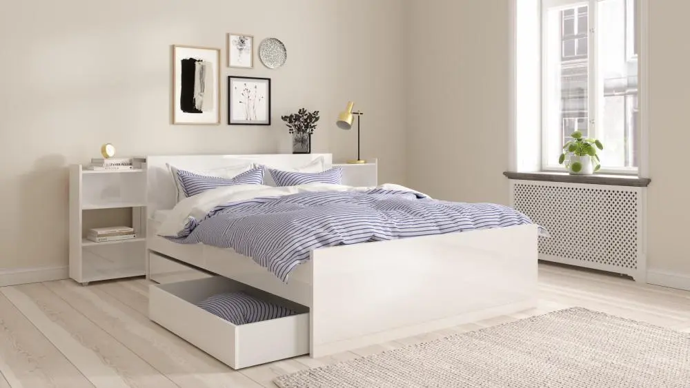 La cama Naia, una combinación perfecta de funcionalidad y diseño minimalista, con un cabecero que ofrece soporte y un práctico espacio de almacenamiento debajo. Ideal para quienes buscan comodidad y estilo en su dormitorio.