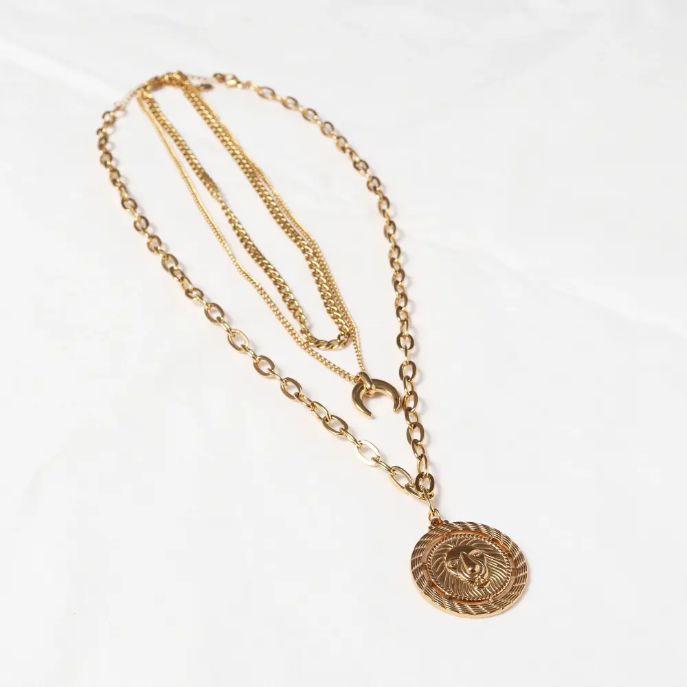 Con un diseño multicapa, este collar presenta un conjunto de cadenas entrelazadas con diferentes texturas y grosores, culminando en un llamativo colgante circular de león y un pequeño dije en forma de luna creciente, mientras que su diseño distintivo lo convierte en un accesorio versátil, perfecto para añadir un toque sofisticado a cualquier look.