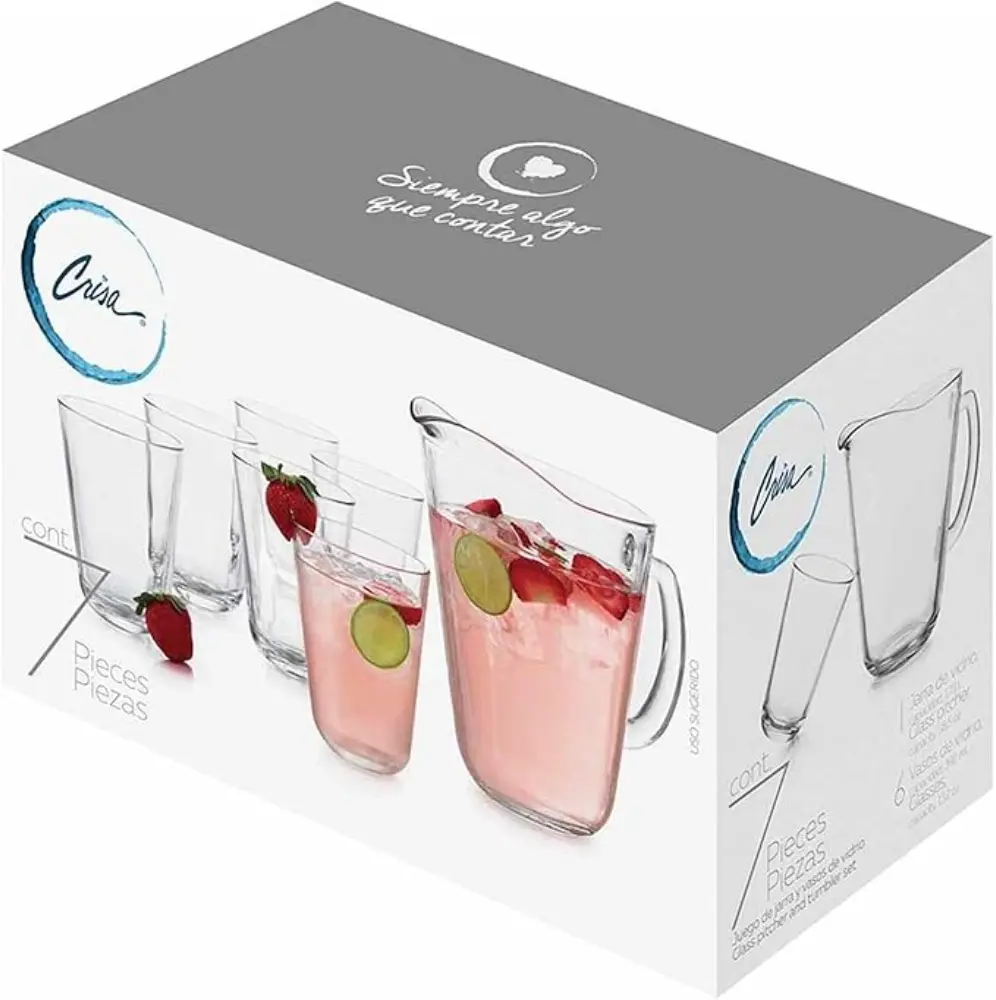 La jarra, de diseño simple y capacidad generosa, está fabricada en vidrio de alta calidad, asegurando durabilidad y una estética clara que resalta cualquier bebida. Los 7 vasos incluidos, con un diseño práctico y cómodo, son ideales para acompañar el servicio, ya sea en comidas familiares, reuniones o celebraciones. Tanto la jarra como los vasos son fáciles de limpiar, resistentes y aptos para el uso diario.