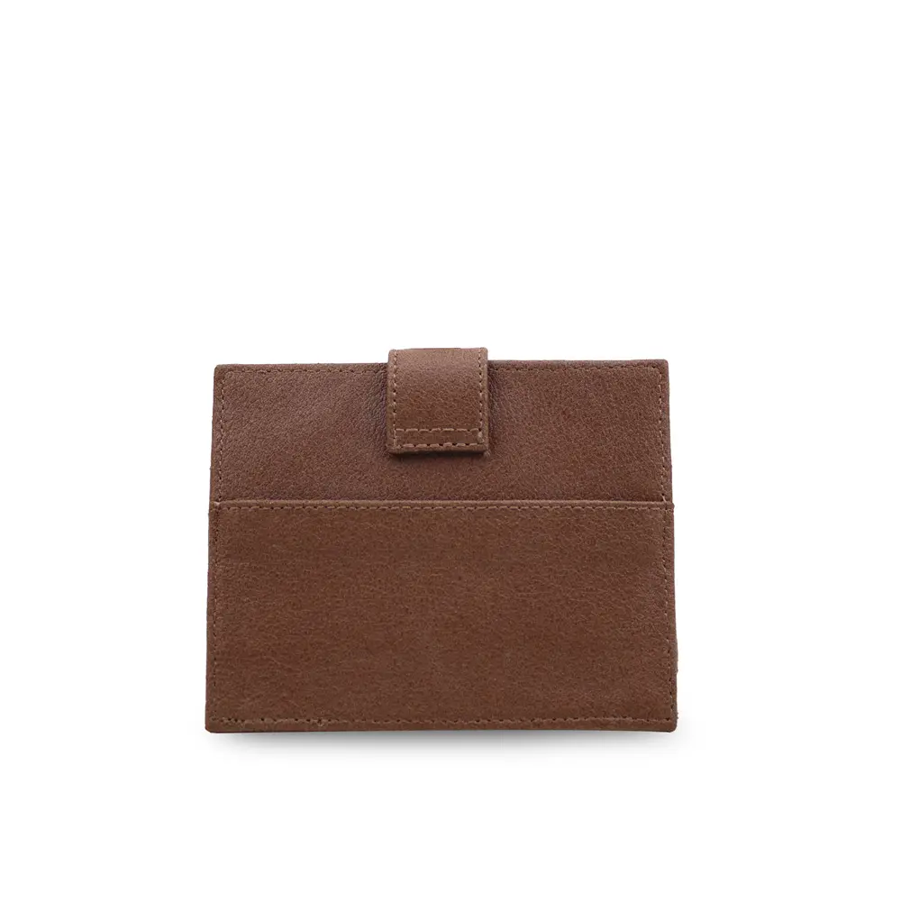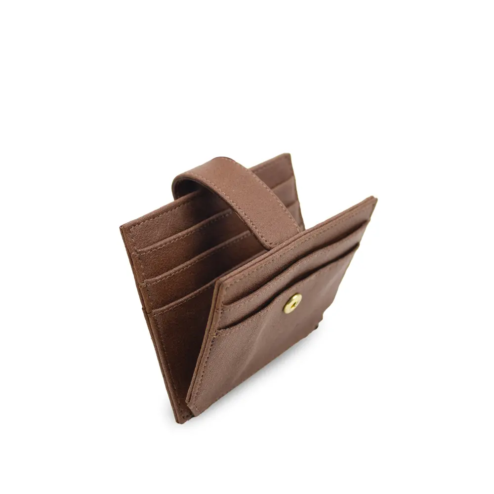 Su diseño delgado permite llevarlo cómodamente en cualquier bolsillo o bolso sin sacrificar espacio. Dispone de ranuras perfectamente distribuidas para tarjetas, así como un práctico compartimento con broche que asegura tus pertenencias con estilo. El acabado texturizado aporta un toque de distinción, mientras que los detalles cosidos demuestran un cuidado artesanal.