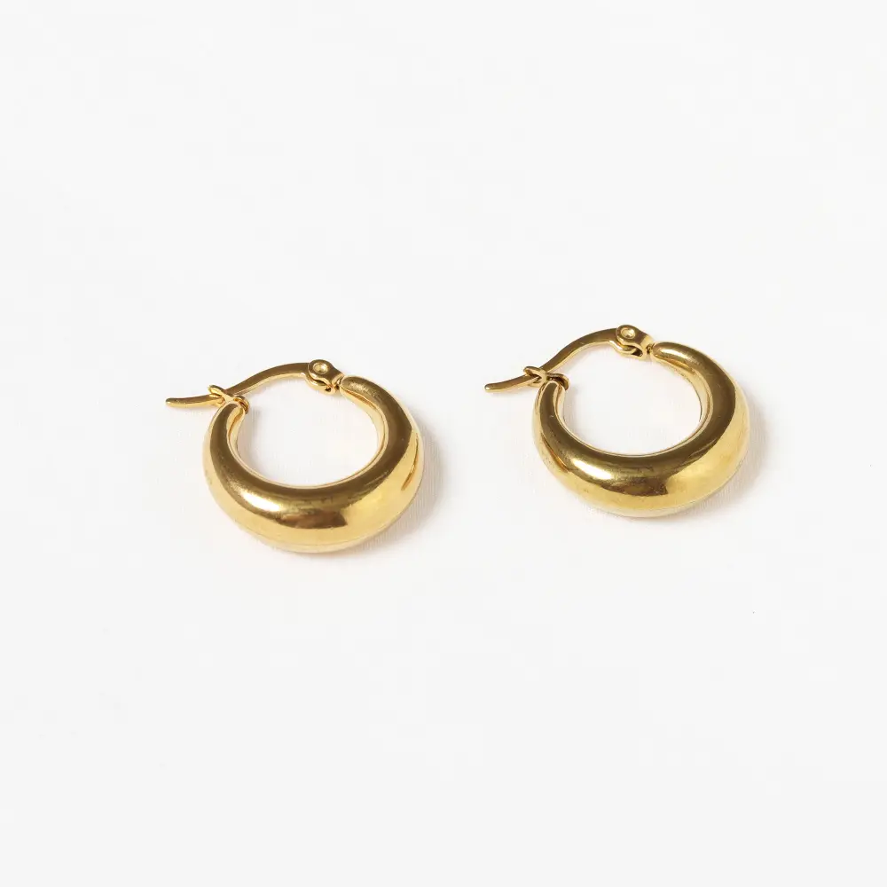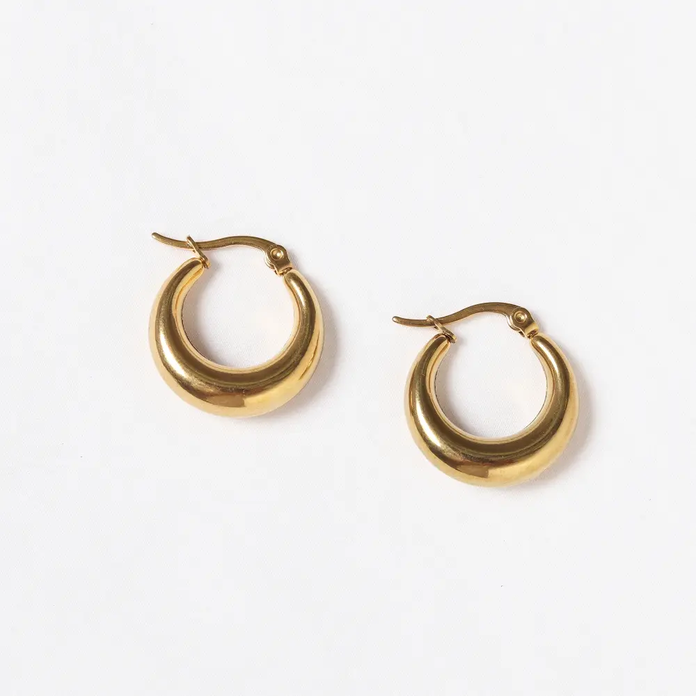 Con un diseño moderno y minimalista, estos zarcillos presentan una forma de aro grueso y abultado, con un acabado pulido y brillante que refleja la luz, mientras que su diseño elegante y contemporáneo los convierte en un accesorio versátil, perfecto para añadir un toque de sofisticación a cualquier look, desde casuales hasta más formales.