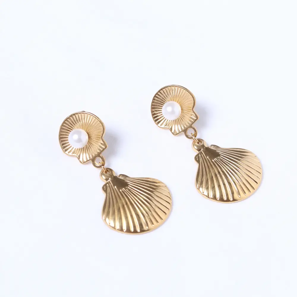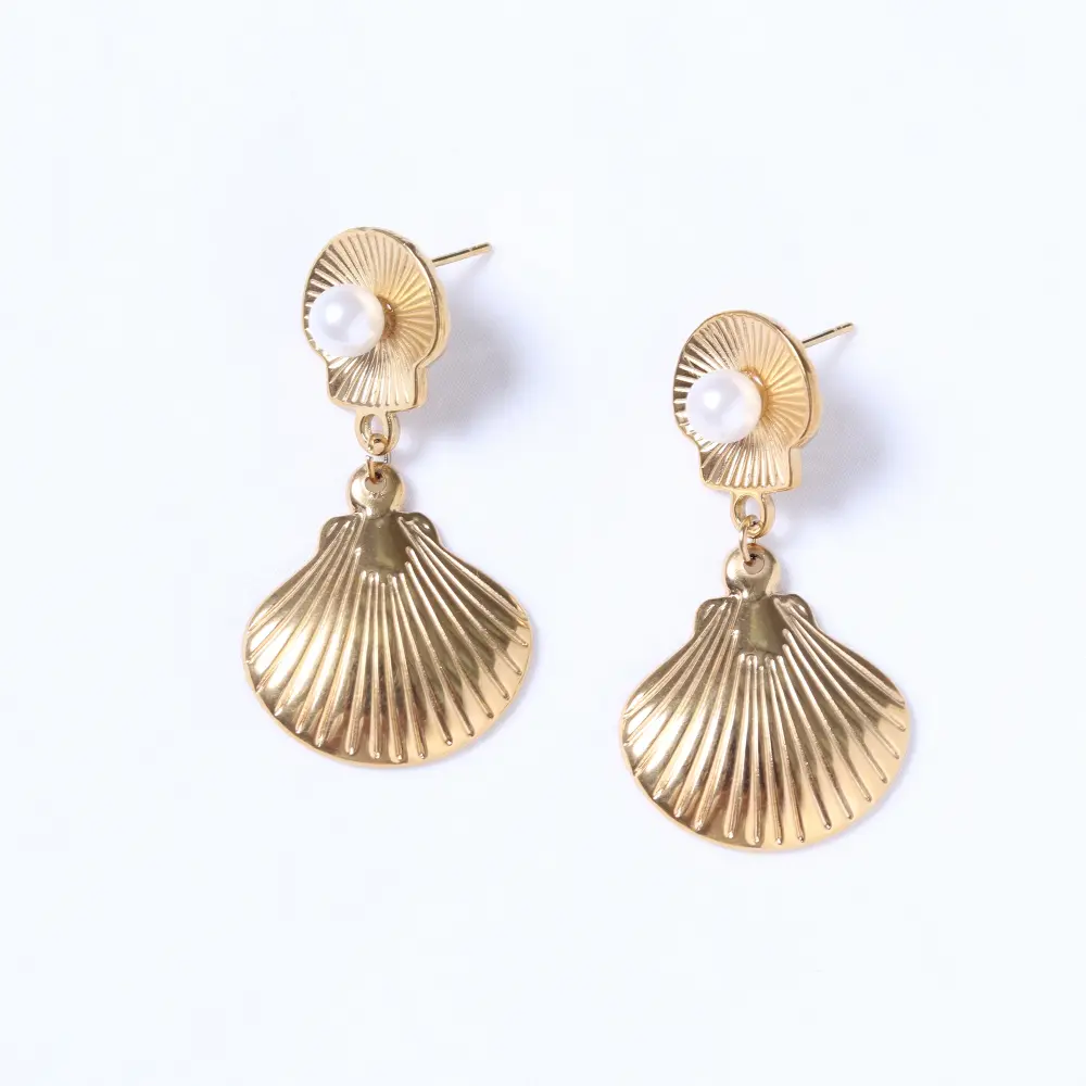 n nCon un diseño inspirado en la naturaleza, estos zarcillos presentan una silueta de concha marina, con una base superior más pequeña que alberga una delicada perla, de la cual cuelga una concha más grande con detalles estriados. Su diseño elegante los convierte en un accesorio ideal para complementar cualquier look, desde casuales hasta formales. n n